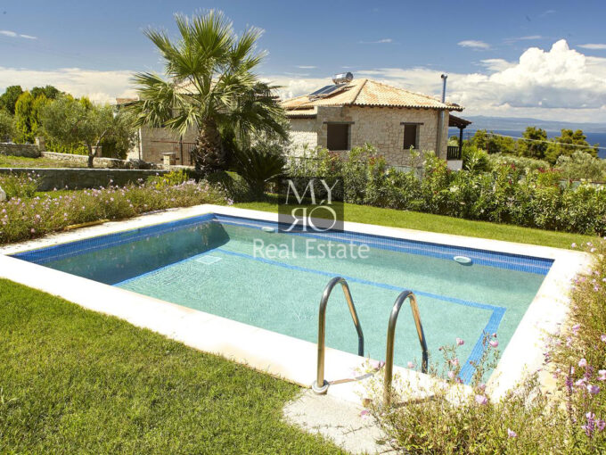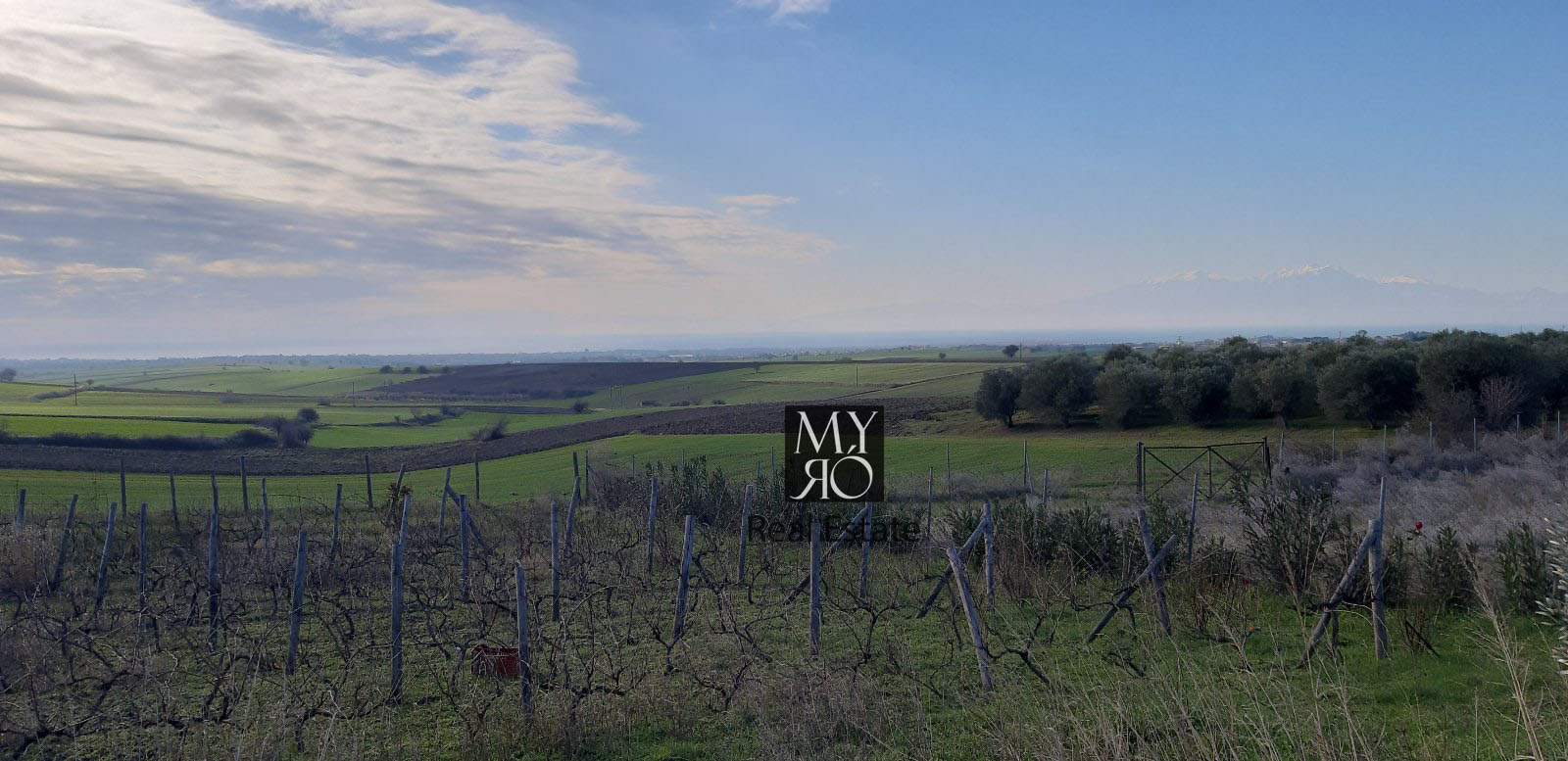 For sale a plot of 4050 sq. m., fenced with 50 new olive trees and 1000 sq.m. of Vineyard on a hill with panoramic views of Mount Olympus and the Thermaikos Gulf. Existing building permit for a villa of 200 sq.m. Located in an area with excellent villas-maisonettes newly built and under construction.