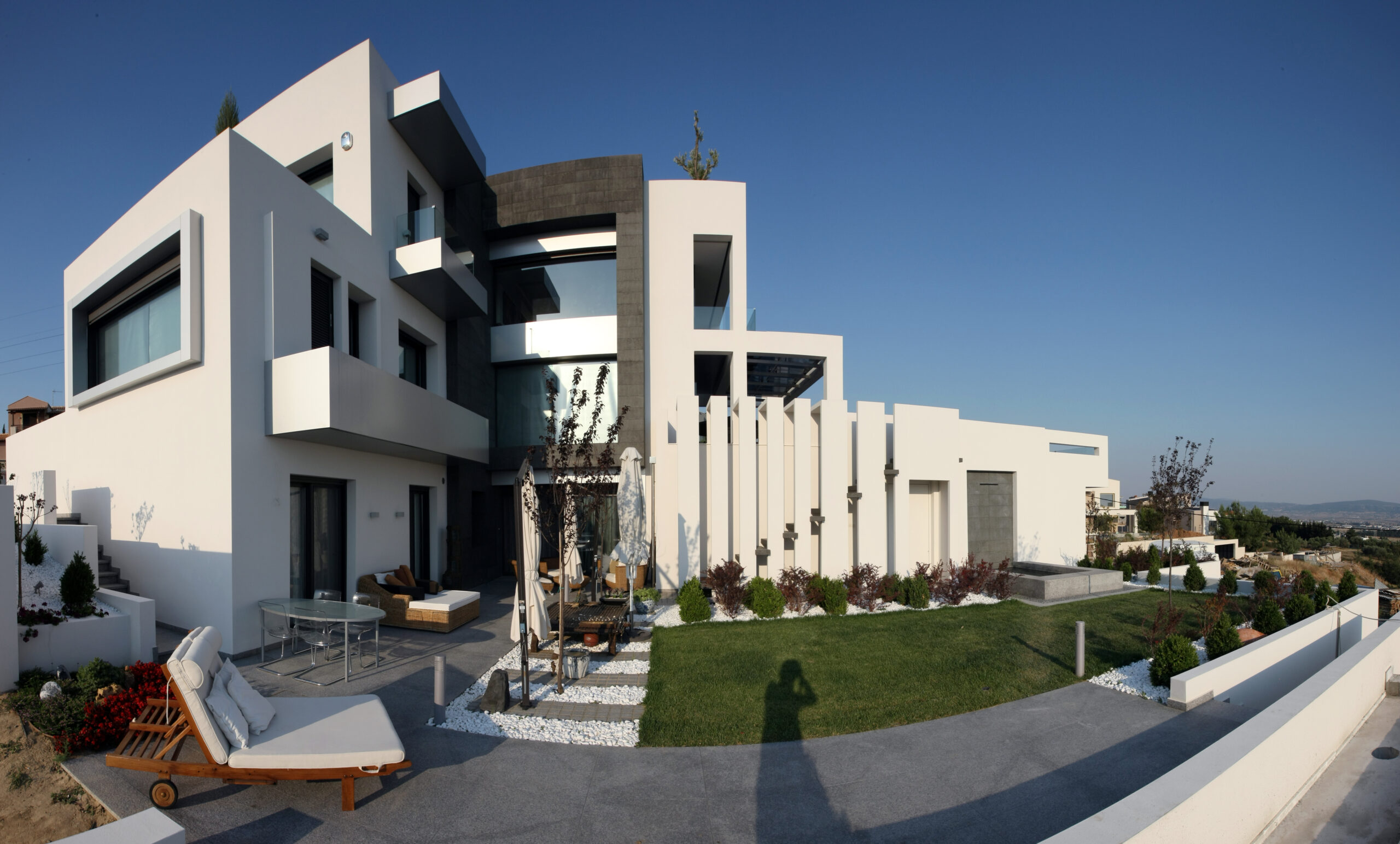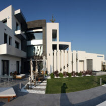 An, over 1,000 sq.m., unique luxury villa, shaped in 4 levels and consisted of 2 part (2 buildings), in a 3,200 sq.m. plot, at the eastern area of Panorama with panoramic view over the Thermaikos Gulf. It’s designed with inspiration and decorated according to the latest designing trends. It has in total: 7 bedrooms with the same numbers of bathrooms respectively, double kitchens, food and entertainment rooms, gym, 2 pools with one of them having a glass shed, roof garden, spa, impressive jacuzzi, sauna and a Turkish bath, pioneering bioclimatic design (solar panels, geothermal energy, in-floor heating, heating pump, automatic cooling/ heating, energy fireplace), elevator, contemporary electric security system, parking for 6 cars (120 sq.m.), garden and 68 sq.m. staff house. The quality of construction as well as the equipment of the house results in the creation of a high aesthetics project, since the building is lined with granite, has all the technological and bioclimatic features for a pleasant living and combines technology and ecology. The building is sold furnished and has many artistic and decorative works (paintings, sculptures) of great value.